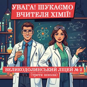 У Великодолинський ліцей №2 (третя школа) потрібен вчитель хімії.